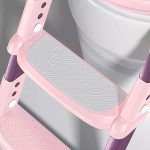 A escada é ajustável em altura, com degraus largos e base antiderrapante que garantem acesso seguro ao vaso sanitário.